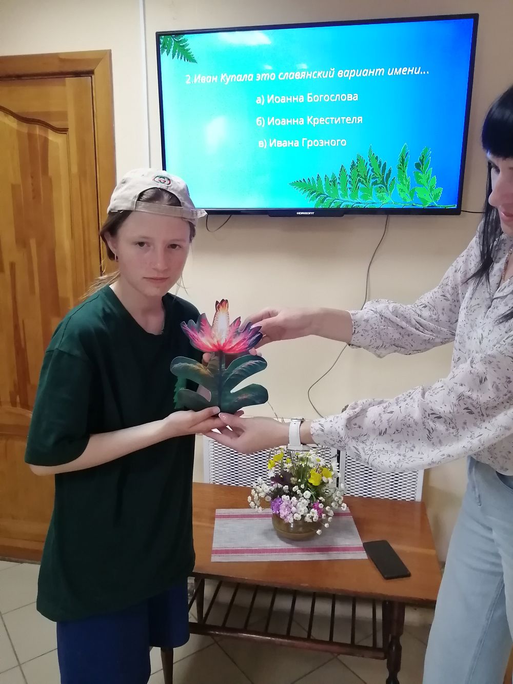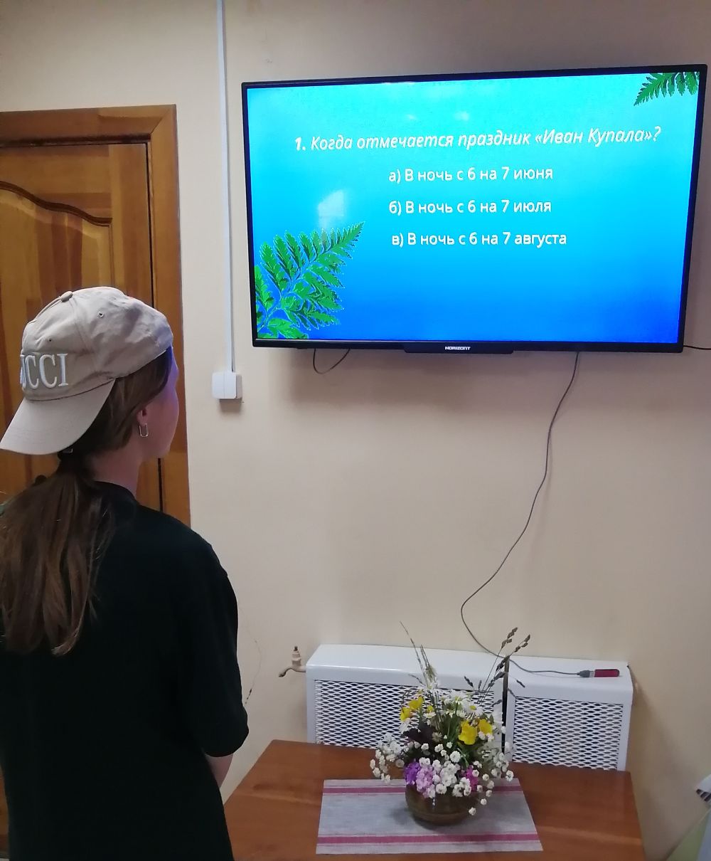 Библиотекарь Светлана познакомила присутствующих с историей, обычаями и обрядами старинного народного праздника, легенде о цветке папоротника. Пригласила принять участие в квест – игре "День Ивана Купала или в поисках волшебного цветка”, которая ещё больше помогла раскрыть все таинства завораживающей ночи. По итогам ее проведения, победитель был награжден «папарать-кветкой». А также не обошли традицию, загадали желание. А чтобы оно сбылось, а оно обязательно исполнится в этот сказочный день, участники завязывали на веточках ленточки.