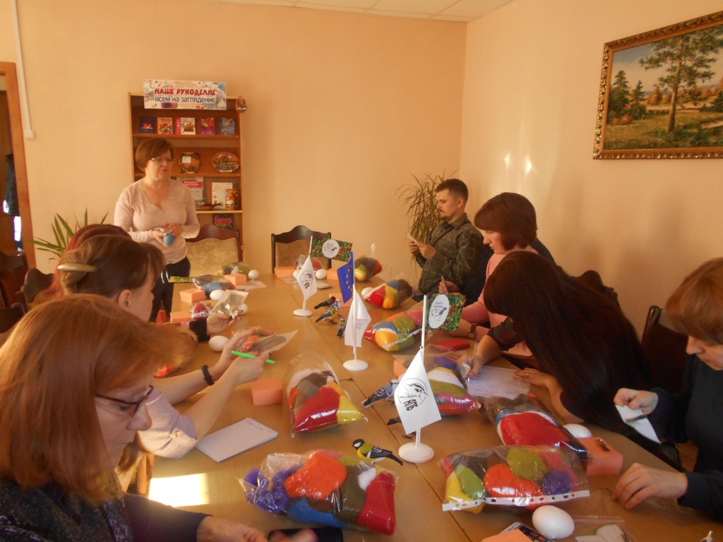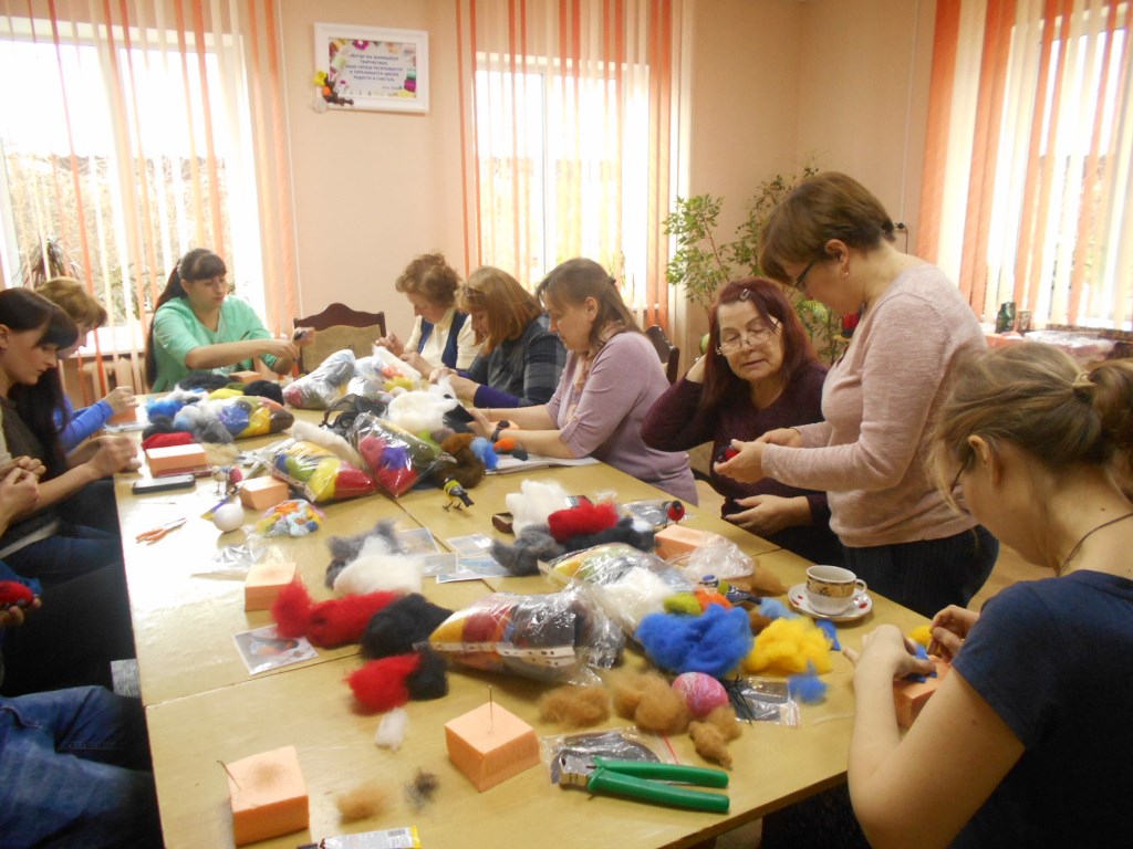 Через несколько часов разноцветные комочки превратятся в красивые сувенирные изделия. А пока в библиотечную гостиную один за другим собирались мастера, знакомились с экспозицией “Наше рукоделье всем на загледенье“. Мастер–классы проводила Ольга Каминская, специалист высокого класса.