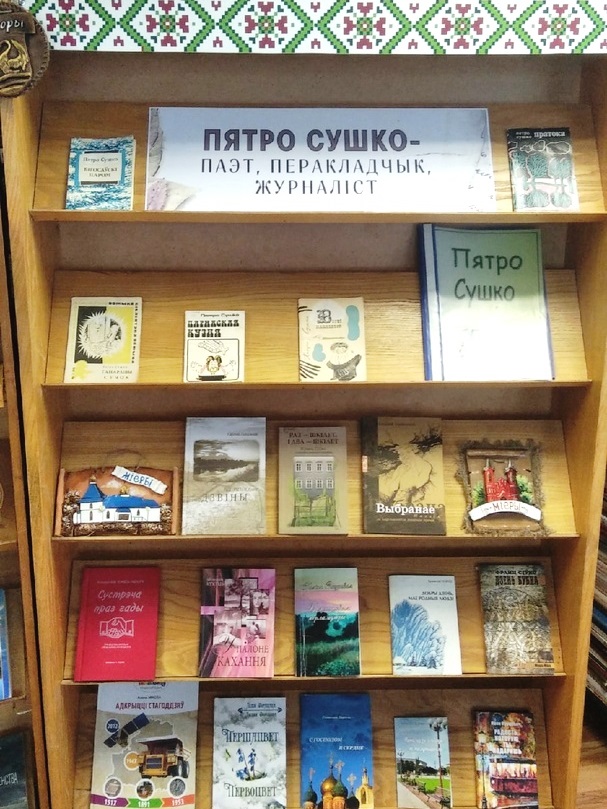 11 студзеня нашаму земляку, паэту Пятру Паўлавічу Сушко споўнілася б 85 год. Напярэдадні юбілея пісьменніка ў чытальнай зале Міёрскай цэнтральнай раённай бібліятэкі падрыхтавана адкрытая выстава ”Пятро Сушко – паэт, перакладчык, журналіст“, дзе ўсе жадаючыя маглі азнаёміцца з творчасцю паэта. Талент Пятра Паўлавіча мнагапланавы, у гэтым упэўніліся 20 студзеня наведвальнікі ТЦСА падчас агляда жыцця і творчасці знакамітага земляка, а ўсім астатнім прапануем пазнаёміцца з біяграфіяй паэта на нашым сайце miory-biblioteka.by у раздзеле “Краязнаўства”.